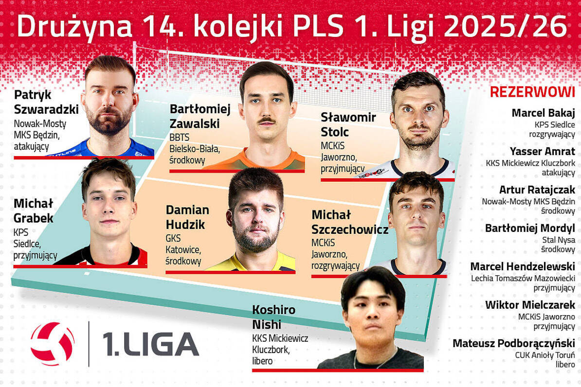 W sezonie 2025/26 PLS 1. Ligi kontynuujemy wybór najlepszych zawodników danej kolejki. Redakcja oficjalnej strony pierwszoligowych rozgrywek po każdej serii spotkań wybiera dwie drużyny, tak zwaną pierwszą szóstkę i rezerwowych. Z wielką przyjemnością przedstawiamy drużynę 14. kolejki!