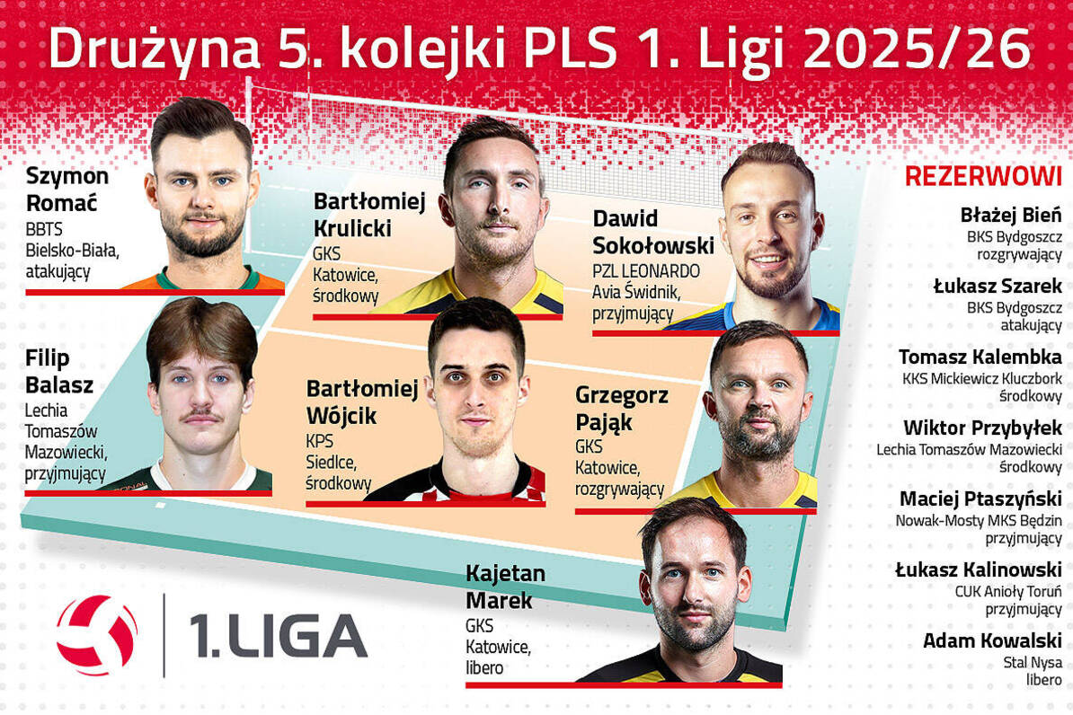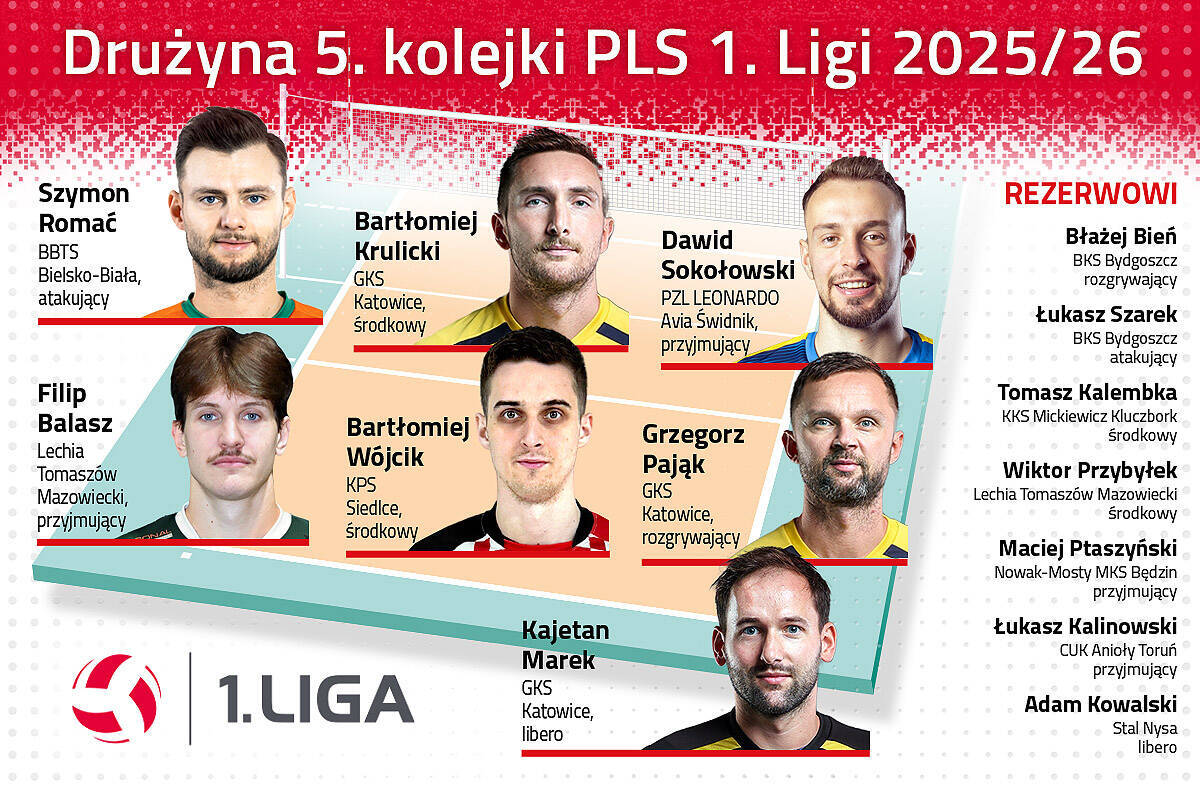 W sezonie 2025/26 PLS 1. Ligi kontynuujemy wybór najlepszych zawodników danej kolejki. Redakcja oficjalnej strony pierwszoligowych rozgrywek po każdej serii spotkań wybiera dwie drużyny, tak zwaną pierwszą szóstkę i rezerwowych. Z wielką przyjemnością przedstawiamy drużynę 5. kolejki!